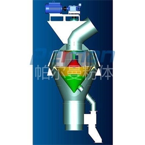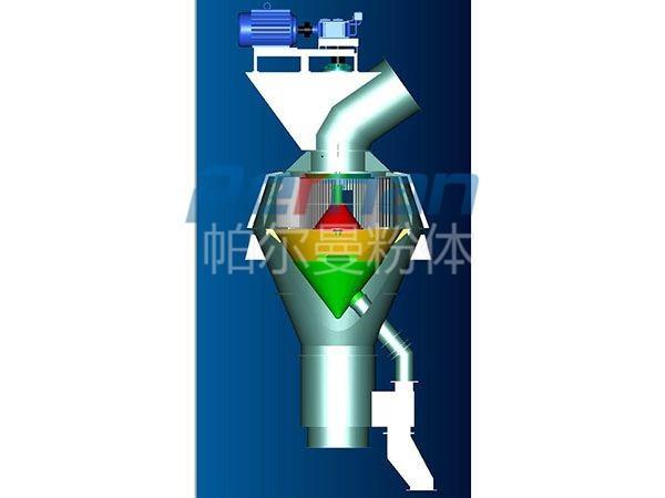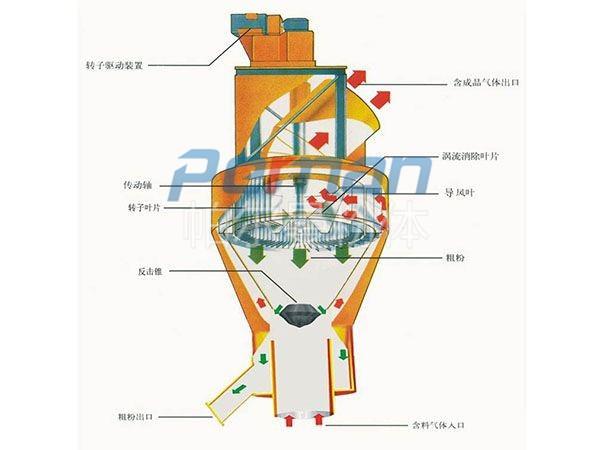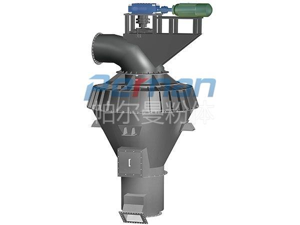 氣流分級機與旋風(fēng)分離器、除塵器、引風(fēng)機組成一套分級系統(tǒng)。物料在風(fēng)機抽力作用下由分級機下端入料口隨上升氣流高速運動至分級區(qū),在高速旋轉(zhuǎn)的分級渦輪產(chǎn)生的強大離心力作用下