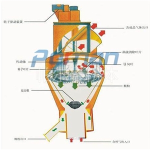 氣流分級機與旋風(fēng)分離器、除塵器、引風(fēng)機組成一套分級系統(tǒng)。物料在風(fēng)機抽力作用下由分級機下端入料口隨上升氣流高速運動至分級區(qū),在高速旋轉(zhuǎn)的分級渦輪產(chǎn)生的強大離心力作用下,使粗細物料分離,符合粒徑要求的細顆粒通過分級輪葉片間隙進入旋風(fēng)分離器或除塵器收集,粗顆粒夾帶部分細顆粒撞壁后速度消失,沿筒壁下降至二次風(fēng)口處,經(jīng)二次風(fēng)的強烈淘洗作用,使粗細顆粒分離,細顆粒上升至分級區(qū)二次分級,粗顆粒下降至卸料口處排出。● 適用于干法微米級產(chǎn)品的精細分級,可分級球狀、片狀、針狀的顆粒,也可對不同密度的顆粒進行分級。